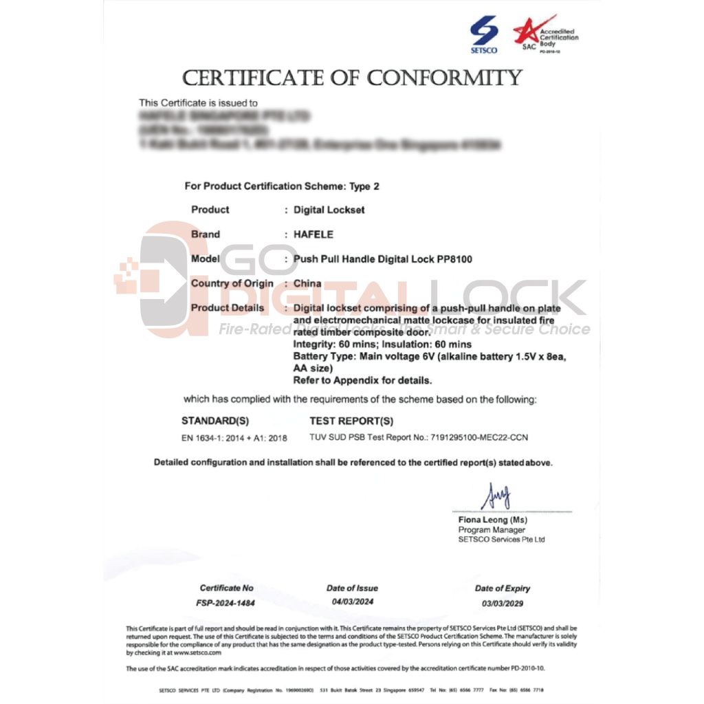 Sample of a CoC Certificate for Hafele PP8100 Fire Rated Digital Door Lock: