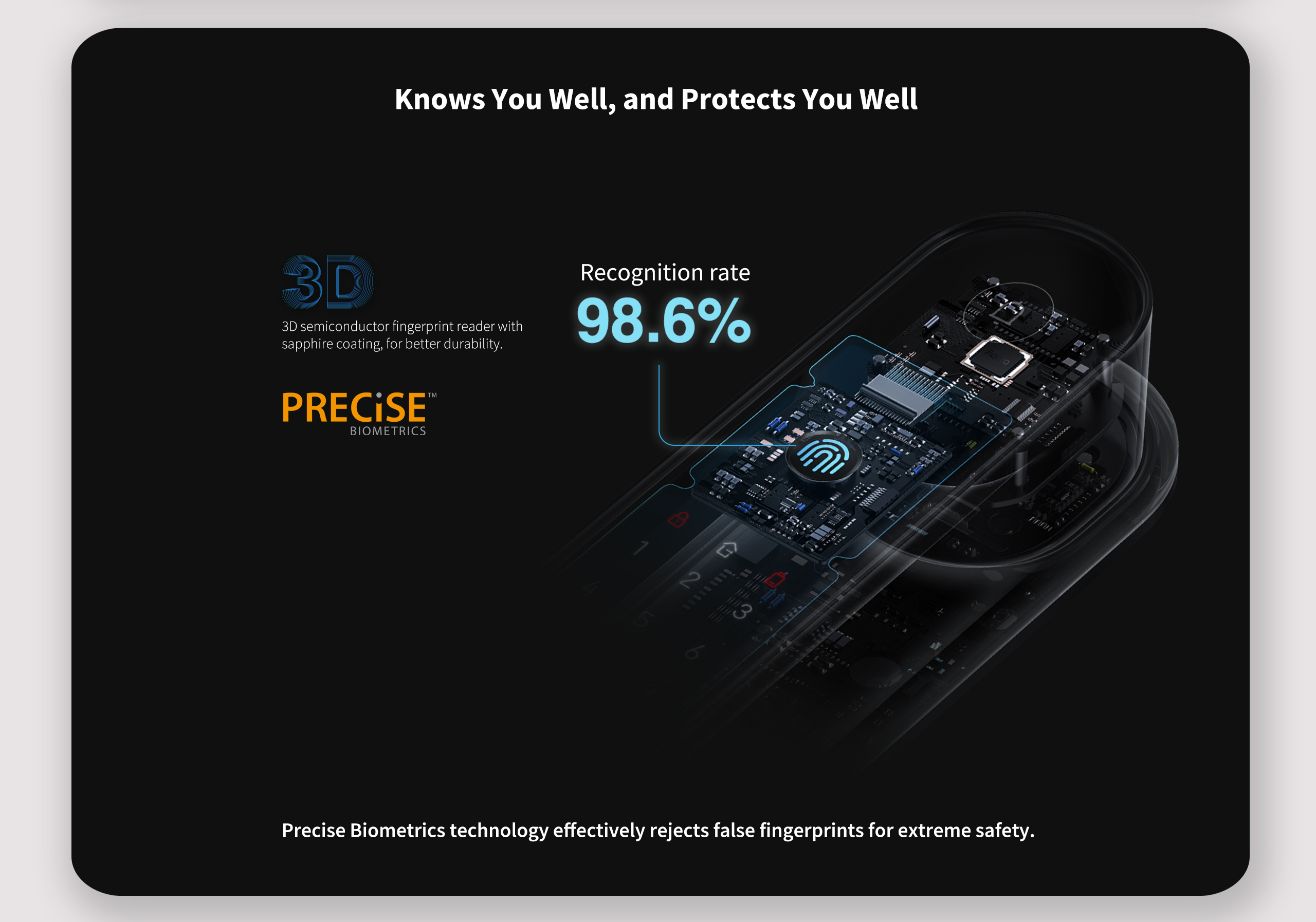 3D semiconductor fingerprint reader with sapphire coating, for better durability.