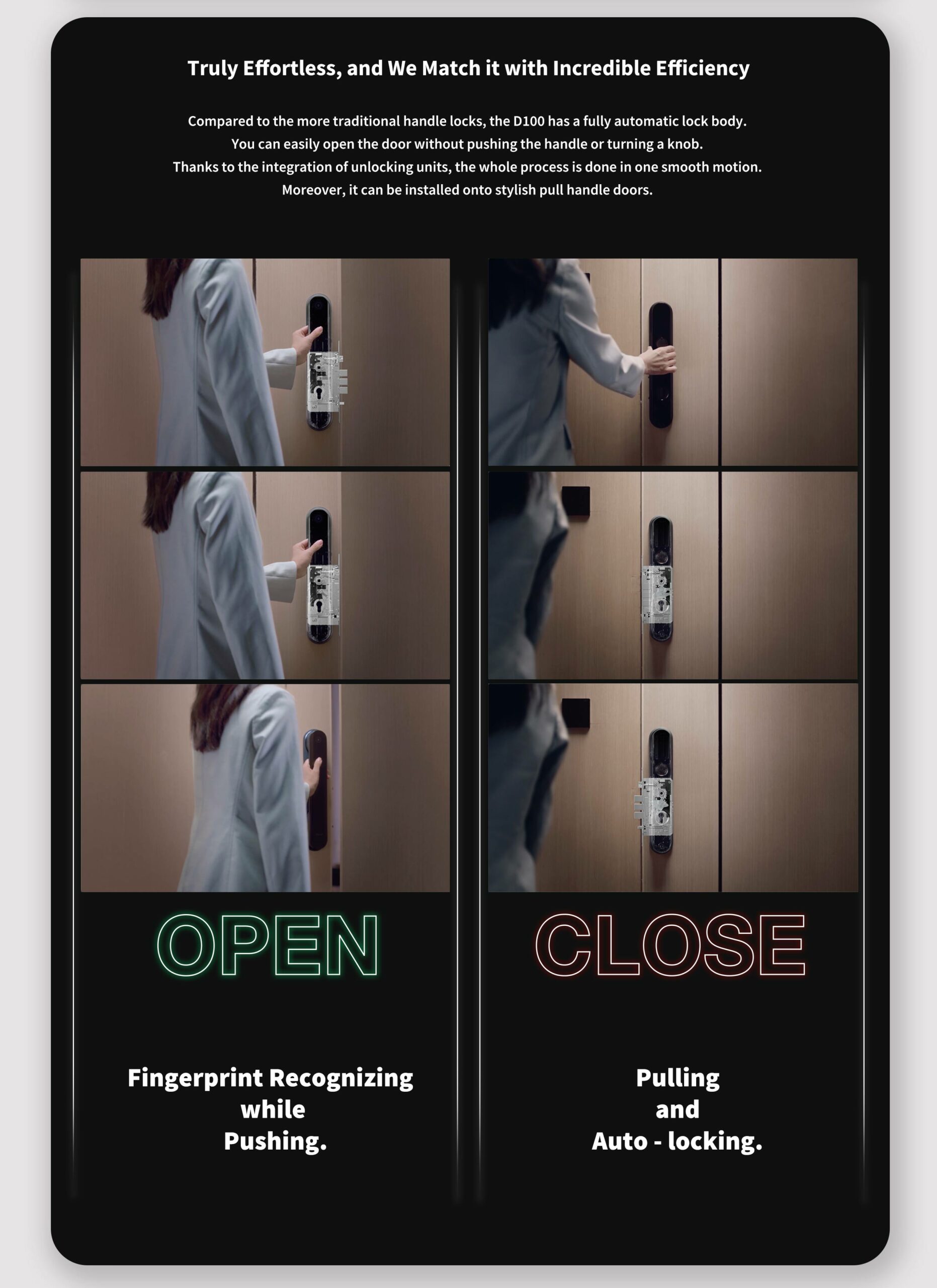 Compared to the more traditional handle locks, the D100 has a fully automatic lock body. You can easily open the door without pushing the handle or turning a knob. Thanks to the integration of unlocking units, the whole process is done in one smooth motion. Moreover, it can be installed onto stylish pull handle doors.